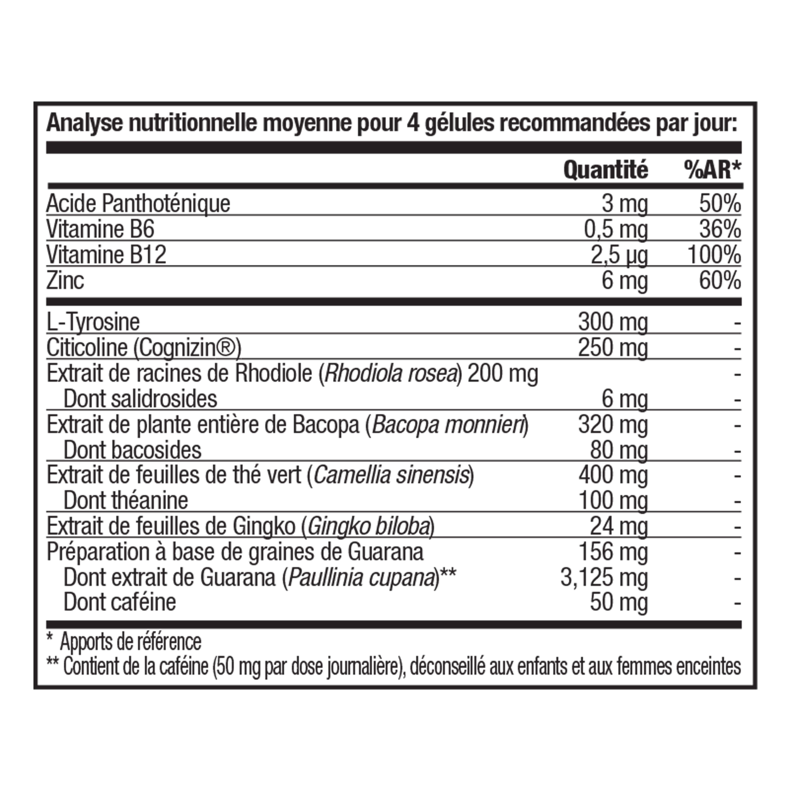Extrait de feuilles de thé vert (Camellia sinensis L. O. Ktze) titré en théanine, extrait de plante entière de Bacopa (Bacopa monnieri) titré en bacosides, gélule: (agent d’enrobage: ydroxypropylmethylcellulose, eau, épaississant: Carraghénanes, antiagglomérant: chlorure de potassium), L-tyrosine, Citicoline (Cognizin®), extrait de racines de Rhodiole (Rhodiola rosea L.) titré en salidrosides, préparation à base de Guarana [maltodextrine, caféine,extrait de graines de guarana (Paullinia cupanaH.B.K)], extrait de feuilles de Ginkgo (Ginkgo Biloba), bisglycinate de zinc, antiagglomérant: dioxyde de silicium, sels de magnésium d’acides gras, d-panthoténate de calcium (vitamine B5), chlorhydrate de pyridoxine (vitamine B6), cyanocobalamine(vitamine B12).